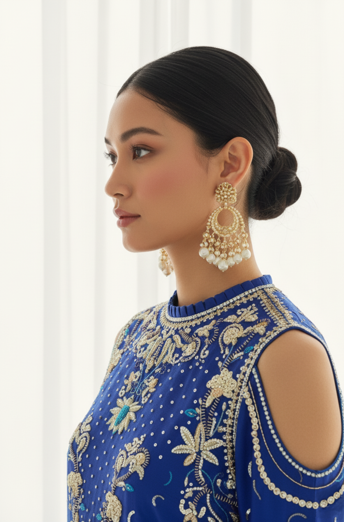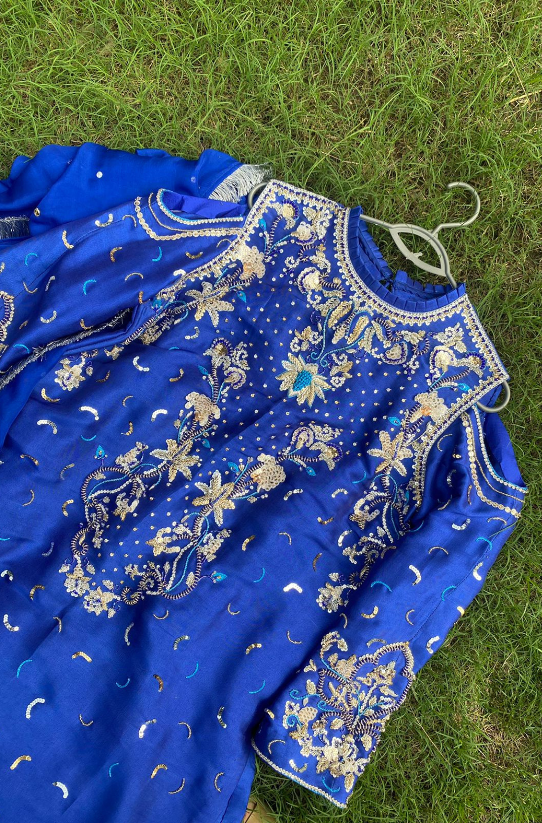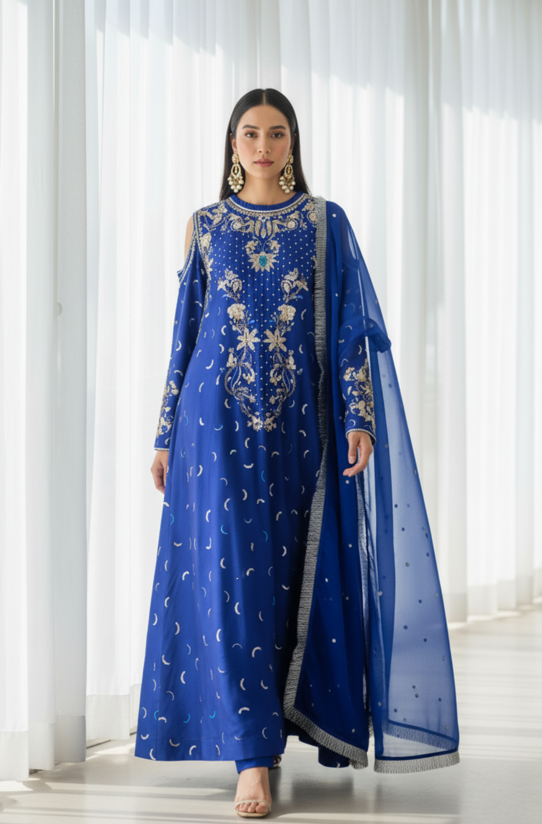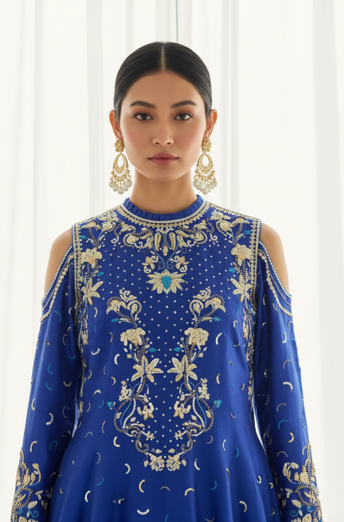 Effortlessly, creating a mesmerizing silhouette that moves with poise and grandeur. Each embellishment is delicately hand-applied — a testament to the artistry and precision of traditional craftsmanship. Paired with a complementing dupatta, Blue Bloom captures the spirit of couture elegance — bold yet serene, opulent yet refined.