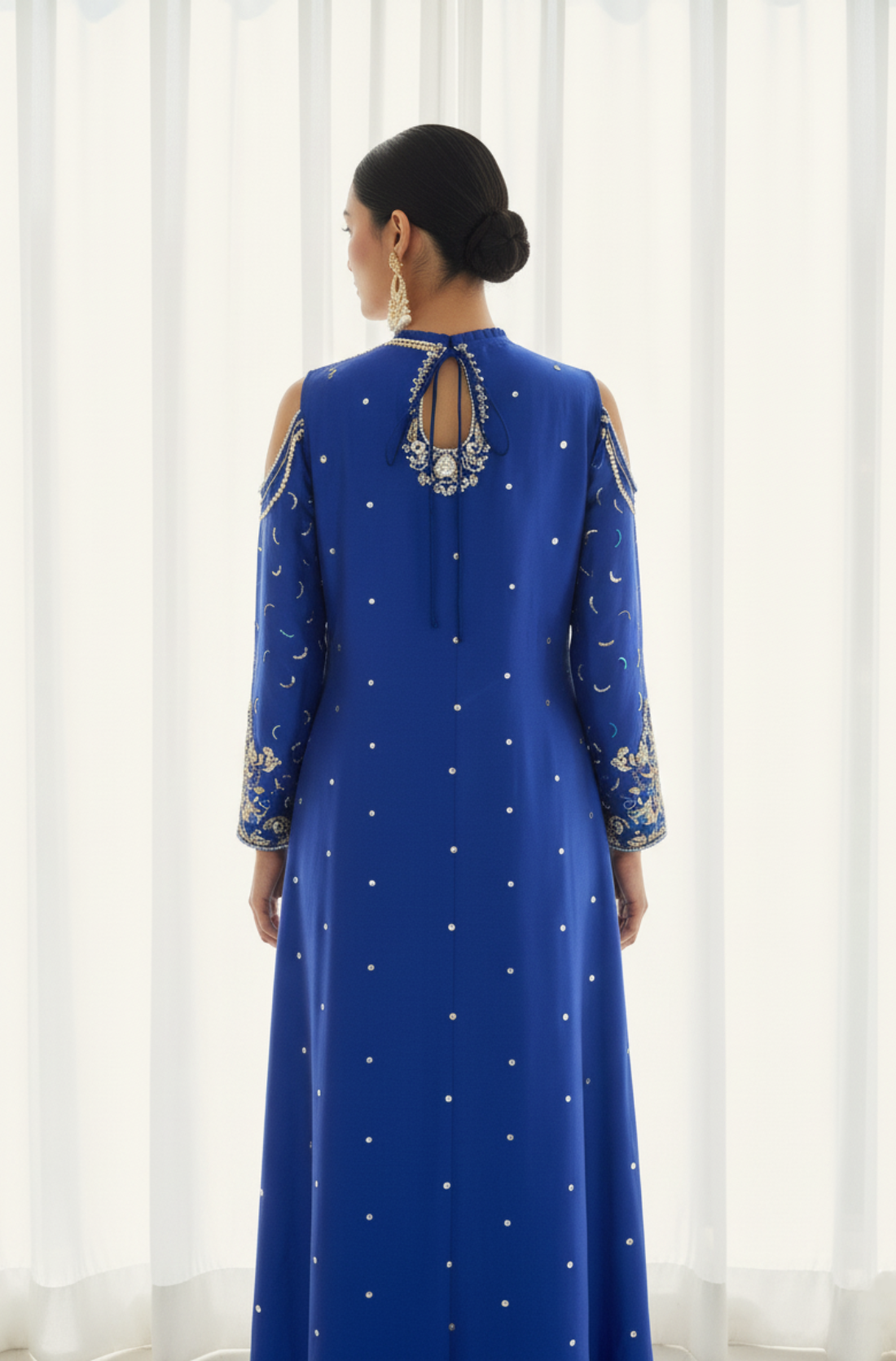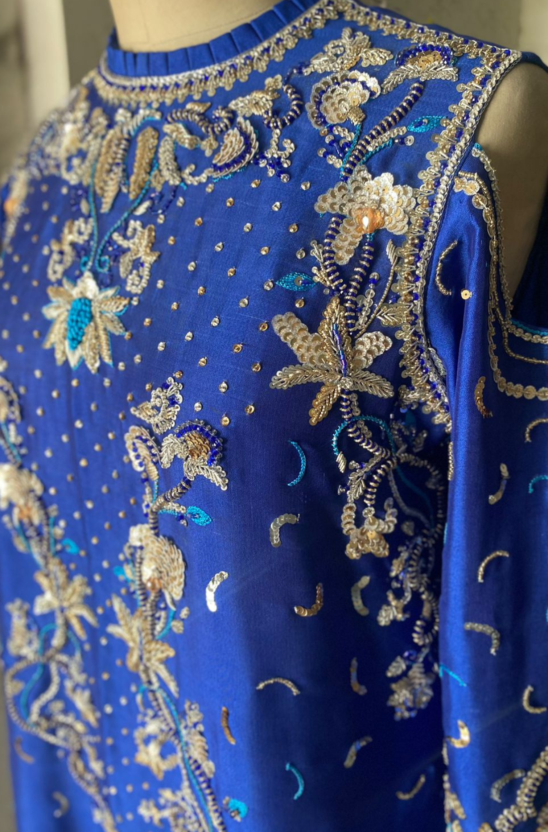 A vision of celestial grace, cobalt charm from the Zarqia Collection embodies regal allure and artisanal beauty. This majestic blue pishwas is exquisitely handcrafted with intricate zari, tilla, resham, and sequin embroidery, illuminating every fold with a touch of timeless luxury.