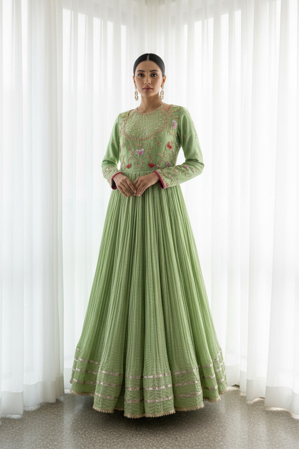 A refreshing ode to elegance, Dew from the Zarqia Collection captures the serenity of nature and the sophistication of couture craftsmanship. This soft green pishwas is exquisitely hand-embellished with resham, tilla, and sequins, forming delicate floral vines that shimmer like morning dew under the light.