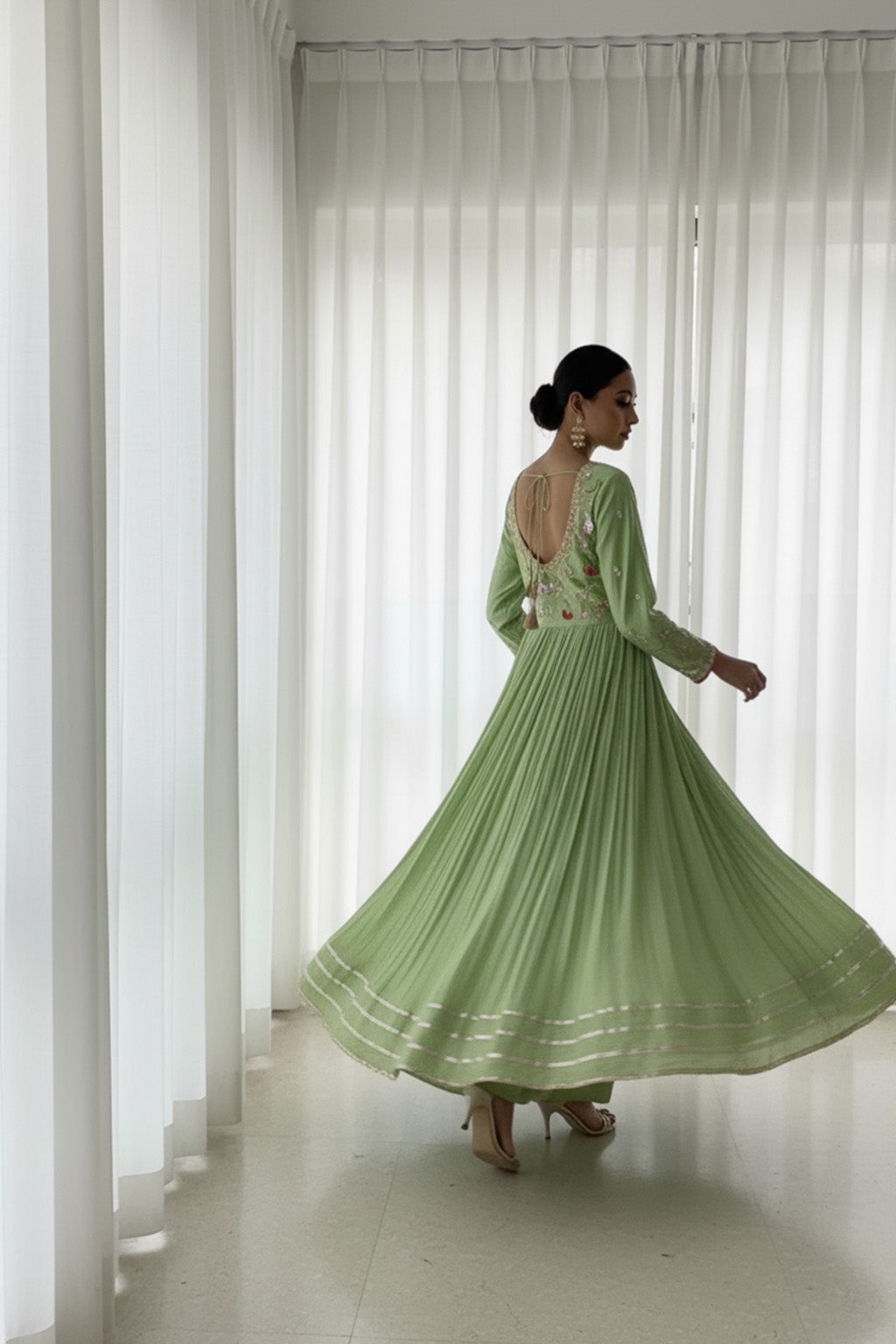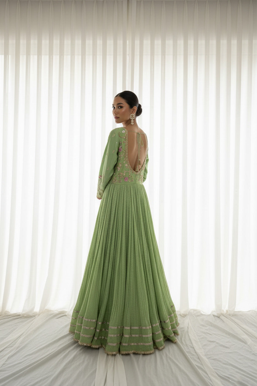The gracefully flared crushed sharara adds a sense of movement and fluid charm, while the subtle detailing on the sleeves and hemline reflects exceptional hand artistry. Every inch of Dew is meticulously finished by artisans, ensuring refined beauty and unmatched quality — a piece that feels as serene as it looks.