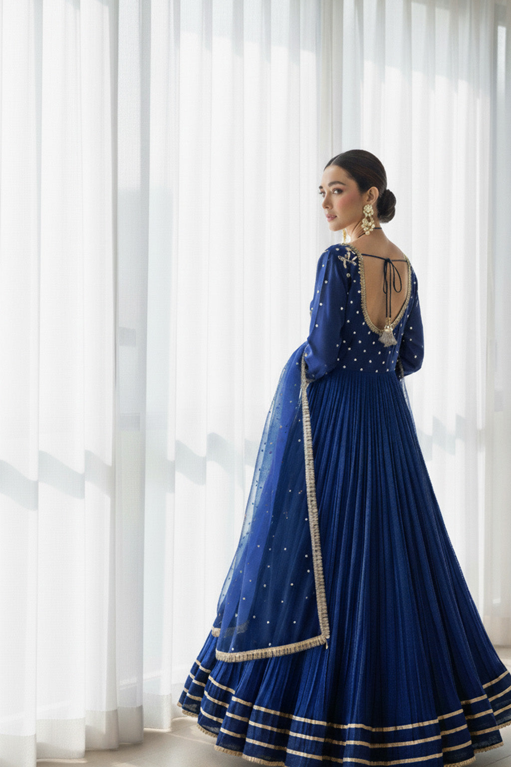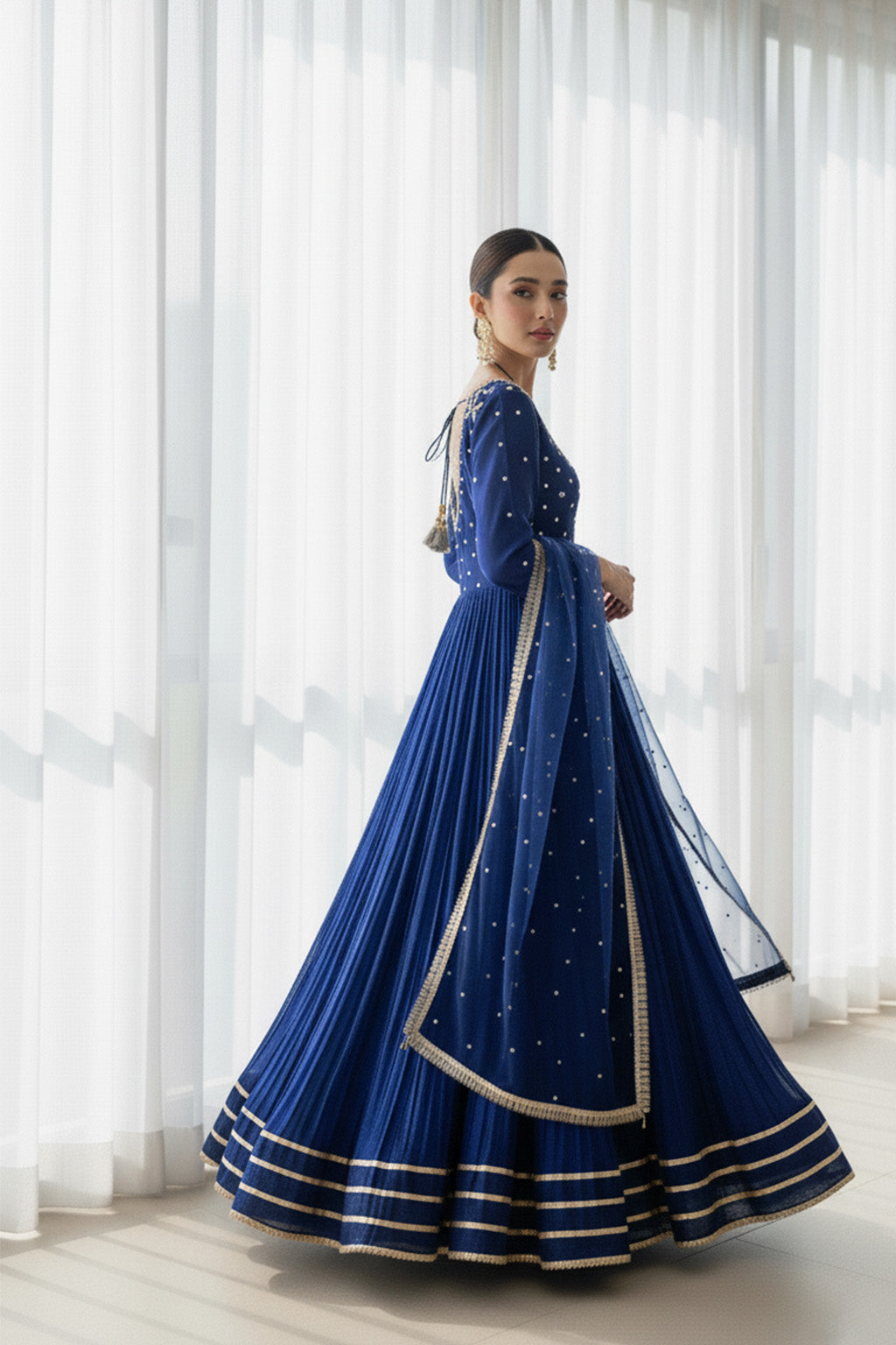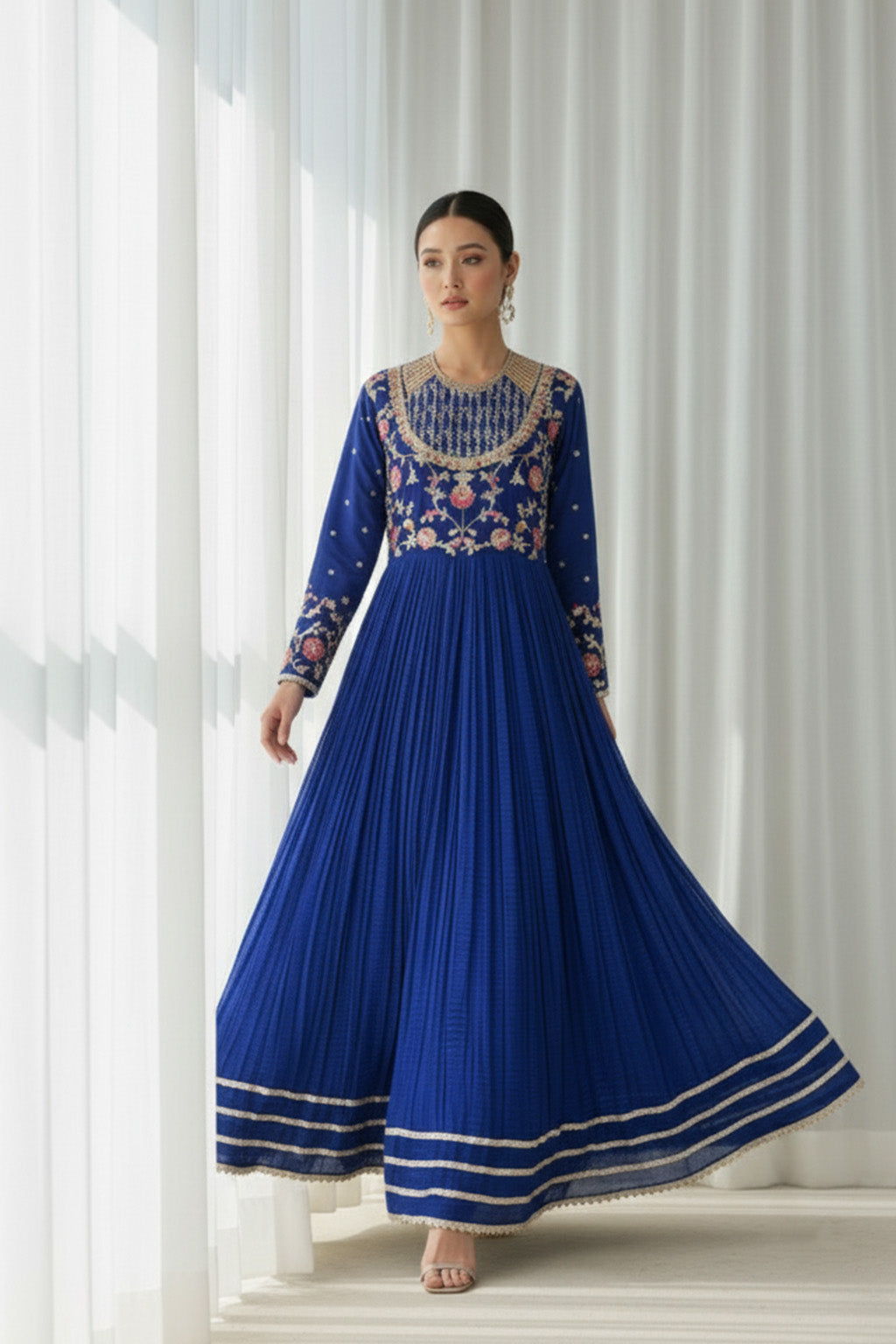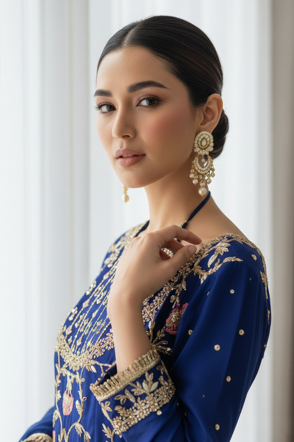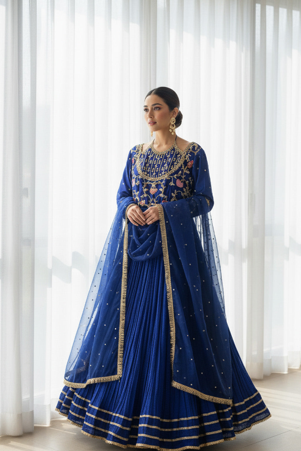 The flared crushed sharara flows effortlessly, creating a mesmerizing silhouette that moves with poise and grandeur. Each embellishment is delicately hand-applied — a testament to the artistry and precision of traditional craftsmanship. Paired with a complementing dupatta, Blue Bloom captures the spirit of couture elegance — bold yet serene, opulent yet refined.